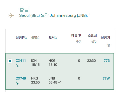 한국에서 남아공으로 가는 직항 노선은 없다. 최단거리라 할 수 있는 노선은 홍콩을 경유하는 방법이다. 홍콩에서는 남아공항공, 캐세이패시픽을 이용해 남아공의 입구인 요하네스버그 OR 탐보 공항으로 향할 수 있다. 만약 인천에서부터 캐세이퍼시픽으로 이용한다면 한결 싼 가격에 요하네스버그까지 갈 수 있다.